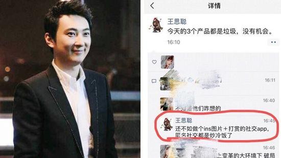 「國民老公」王思聰15日再出犀利點評。他在微信朋友圈發佈貼文稱,「今天的3個產品都是垃圾,沒有機會。」隨後他還在底下的評論表示,「還不如做個ins(Instagram)圖片+打賞的社交app,匿名社交都是炒冷飯了。」