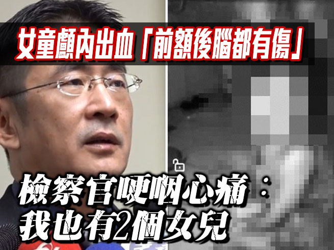 台南一歲女童遭小媽媽及堂姐夫婦、同居人虐死,初步相驗結果出爐。台南地檢署主任檢查官周盟翔表示,女童全身可用體無完膚來形容,頭部甚至出現顱內出血,疑似被抓頭撞牆或是撞地板,前額、後腦均有撞擊跡象;他哽咽,「每次看到女童心裡都非常痛,我也是2個小女孩的父親。」