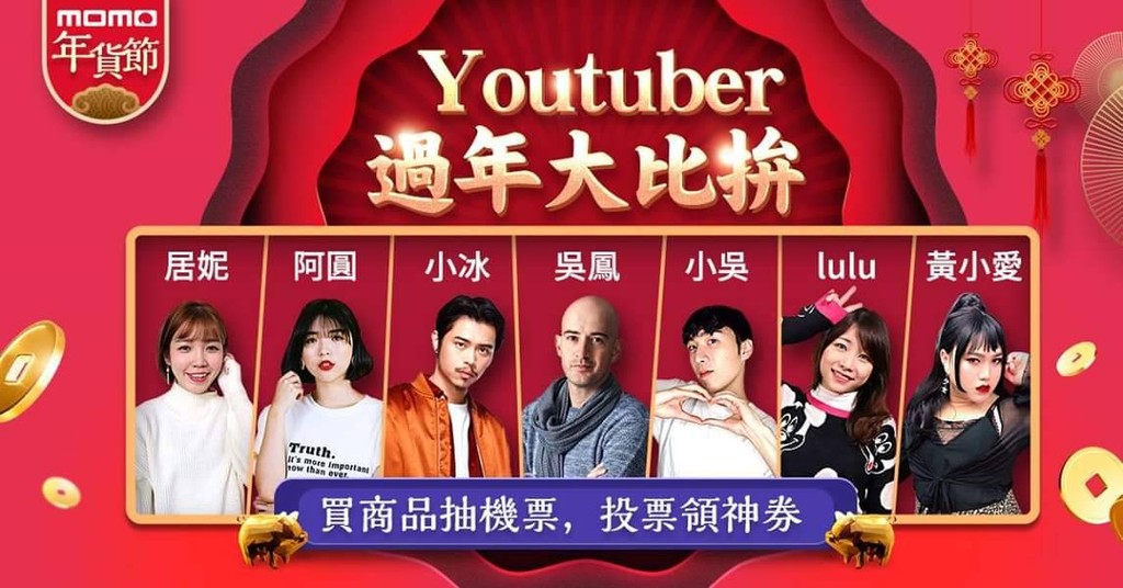 這次邀請吳鳳、黃小愛、小冰、見習網美小吳、路路lulu、一隻阿圓、居妮等許多知名網紅、名人拍攝影片推薦好商品做為購買參考,另同步舉行票選活動,投給你喜歡的Youtuber,就能獲得折價神券,折上加折。若投票的Youtuber在指定時間內獲得最高票數,還有機會抽到Dyson風扇。