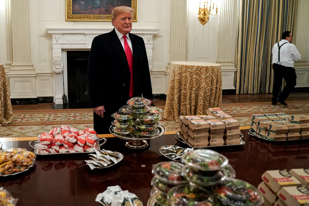 由於政府關門,白宮廚師們全都休假,讓川普選擇買麥當勞、溫蒂漢堡、漢堡王等速食請球員們吃飯。川普推文提到,「在白宮與全國冠軍克萊門森大學老虎美式足球隊(Clemson Tigers)在一起真的是太棒了。因為政府關門,我請客買了很多速食餐點(我付的錢),超過1000個『hamberders』等…不到一個小時,全部都消失了。」