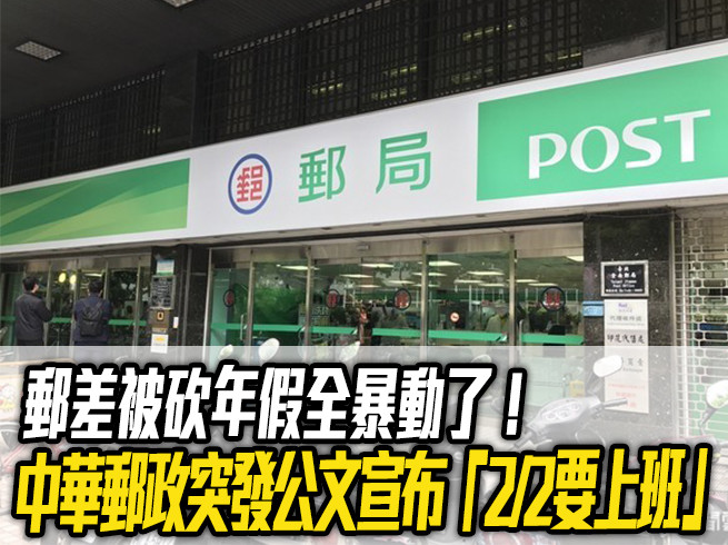 今年春節9天連假,自2月2日展開,但中華郵政近日才突然發公文,宣布2月2日包含限時、普通郵件等全都正常投遞,郵局員工得知消息全暴氣。不少同仁在網上怒轟「別只會凹員工是在凹X小,全台就郵局這樣,真廢」、「訂好回鄉車票的怎辦」和「現在才說要上班會不會太離譜」。