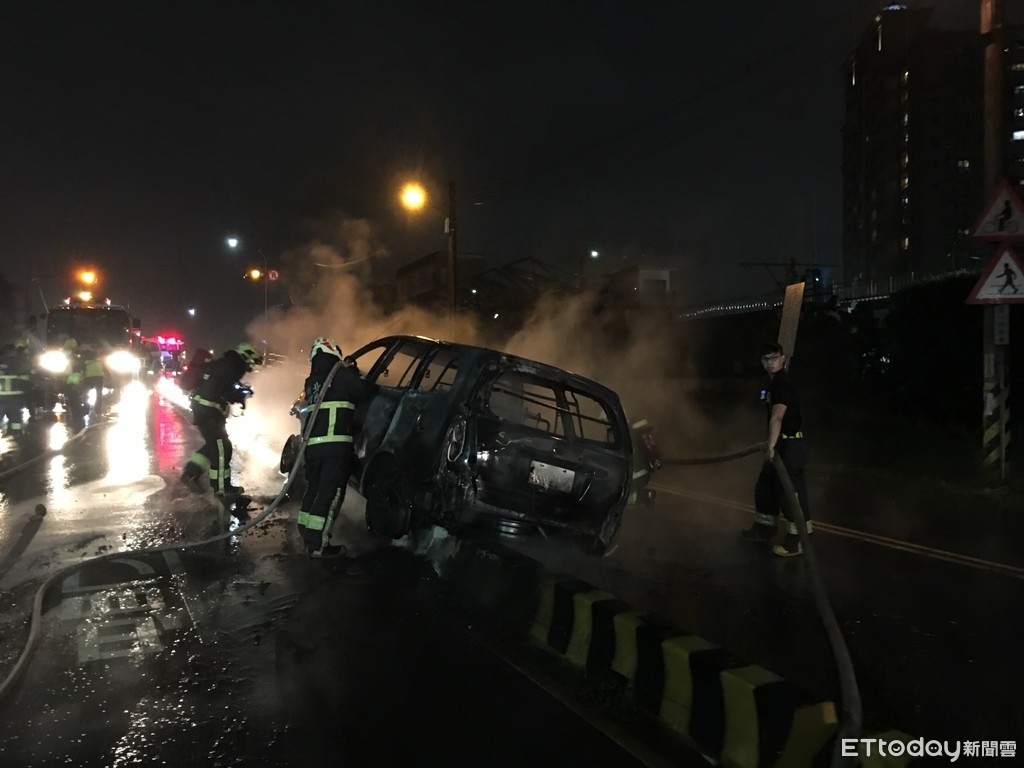 ▲石男駕駛的自小客車整輛燒毀,不斷冒出濃煙。(圖/記者陳以昇、陳雕文翻攝,下同)
