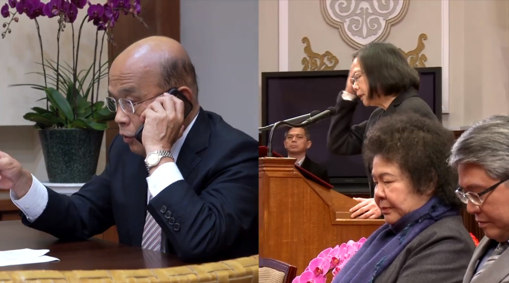 行政院長蘇貞昌16日再度於臉書釋出影片,內容透露他中午入府與總統蔡英文商討豬瘟防疫方向定案,以及重懲虐童的刑法修正草案將商請立法院儘速三讀。影片中一度開雙框,紀錄兩人分別趕著完成公務準備中午的小型便當會,菜色則是一人一碗滷肉飯與白菜湯,兩人都笑著開吃,頻頻說看起來很好吃。