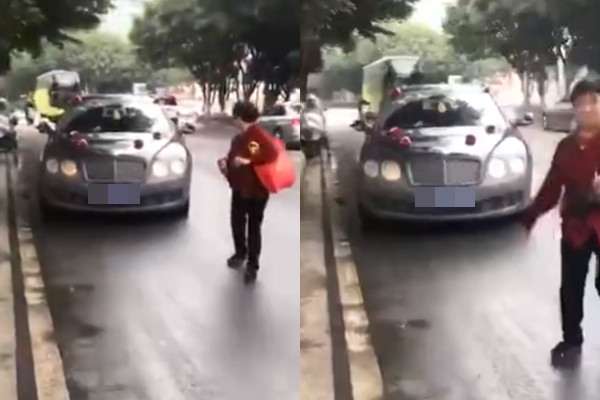 綜合陸媒報導,當時一名紅衣大嬸低頭橫越4線道馬路,完全不理會左右來車。最前方的賓利車見狀,雖減速並鳴按喇叭提醒,但大嬸只抬頭看了一眼便繼續前行,導致後方2輛賓利煞車不及,加上天雨路滑,當場釀成連環追撞。