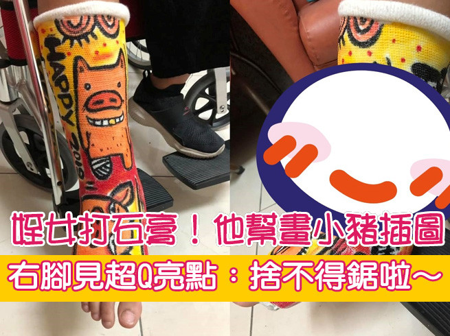 「這就是家裡有插畫家的好處」一位網友在臉書「爆廢公社」中貼出一組照片表示,小朋友因為受傷,右腳打了石膏,但是這卻是全世界獨一無二的款式。只見照片中的石膏充滿了繽紛的橘黃色插畫,還應景豬年畫了兩隻Q版的小豬;最可愛的是,橘色小豬的口中還鑲了一顆金牙,右腳也和主人的一樣受傷,纏上白色繃帶,瞬間變得有趣可愛。