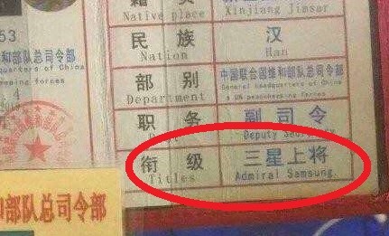報導指出,新疆男子楊永亮向詐騙集團申請高階官員證件,領證後沒幾天就被警方當場逮捕。警方檢查證件看出端倪,上頭「三星上將」的英譯名竟離譜翻成「Admiral Samsung(三星集團海軍上將)」,連籍貫應翻成Jimsar的「吉木薩爾」,也被拼成Jiasar,還有最簡單的生日數字,上排為1971.6.12,在下排的翻譯卻時空穿越到1949年的10月23日,想不被抓到也難。