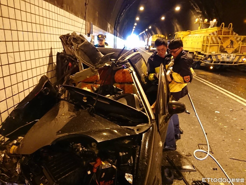 宜蘭蘭陽隧道北上車道17日近中午發生車禍,一輛自小客車與隸屬於公路總局第四區工程處南澳工務段一輛灑水車發生車禍,因撞擊力猛烈,自小客車車頭幾近全毀,零件四處散落,自小客男性駕駛受困車內,被救出時無生命徵象,目前送醫搶救寶貴生命中。