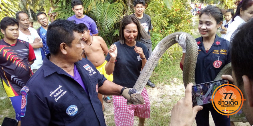 泰國曼谷南方的董里府(Trang)15日有一名女子在家和朋友聊天時,突然闖入一隻6米長的眼鏡王蛇(King Cobra),嚇得她趕緊打電話報警,才得以逃離眼鏡蛇的危險。只是眼鏡王蛇驚動了附近居民,大家全都跑來一賭光彩。