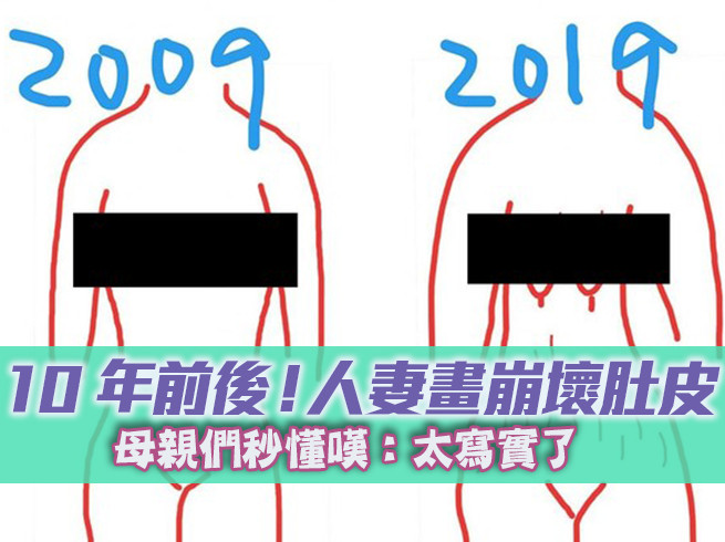 兩個孩子的媽咪深夜畫出2009和2019的對比,笑說「大家都在10年前~10年後~,10年前沒照片,只好用畫的,這辛酸大概只有媽媽們懂。」只見原本的姣好身型,在生下孩子後就不復見了,取而代之的是,大面積的妊娠紋、下垂胸部,及大一號的身材。