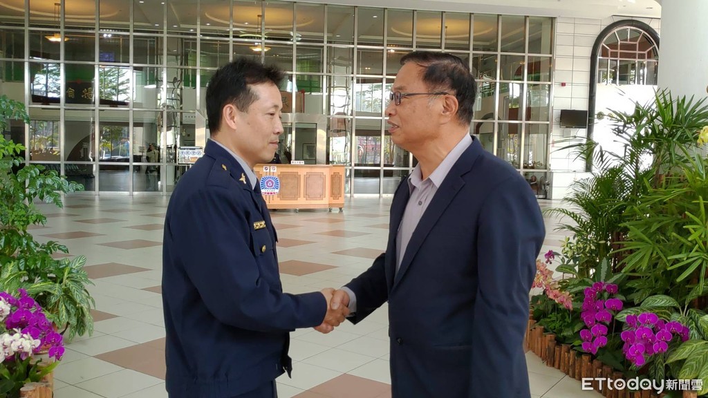 ▲台南市警察局長黃宗仁(右),親自對市警四分局交通組長郭榮木,給予加油鼓勵。(圖/記者林悅攝)