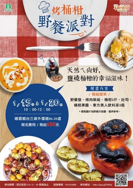 新竹縣峨眉鄉桶柑成熟囉,縣政府為推廣桶柑,也規劃了一系列活動邀請民眾參加,除了可搭乘一日專車欣賞峨嵋好風光,也可品嘗不一樣風味的炭火鹽烤桶柑,另外「桶柑寶寶 抓桶柑計重賽」,則為1月20日限定活動,活動中也將號召一到三歲的大力士寶寶來比賽。