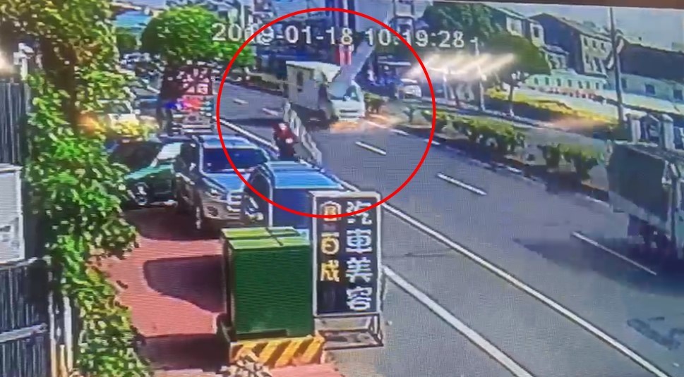 影片中,只見事發當時博愛路上的車流量不算少,一名穿著紅色上衣的騎士靠著路邊緩緩往前騎,沒想到內線車道一輛白色小貨車上的大片板子和鋁梯突然飛落,直接越過一個車道砸了過來,他雖然縮了一下身體做出閃避的動作,但還是被連人帶車砸翻,重摔在地。