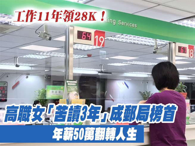 來自台南的王佩宜今年34歲,高職畢業後因家裡經濟因素沒有繼續升學,進了一家小工廠當作業員,幾年後工廠關閉了,又到另一間公司擔任業務助理,至今年資已經11年了,月薪卻仍只有28K。去年她報考了中華郵政,以榜首之姿考取台南郵局內勤櫃台,終於擺脫低薪夢魘,年薪近50萬。
