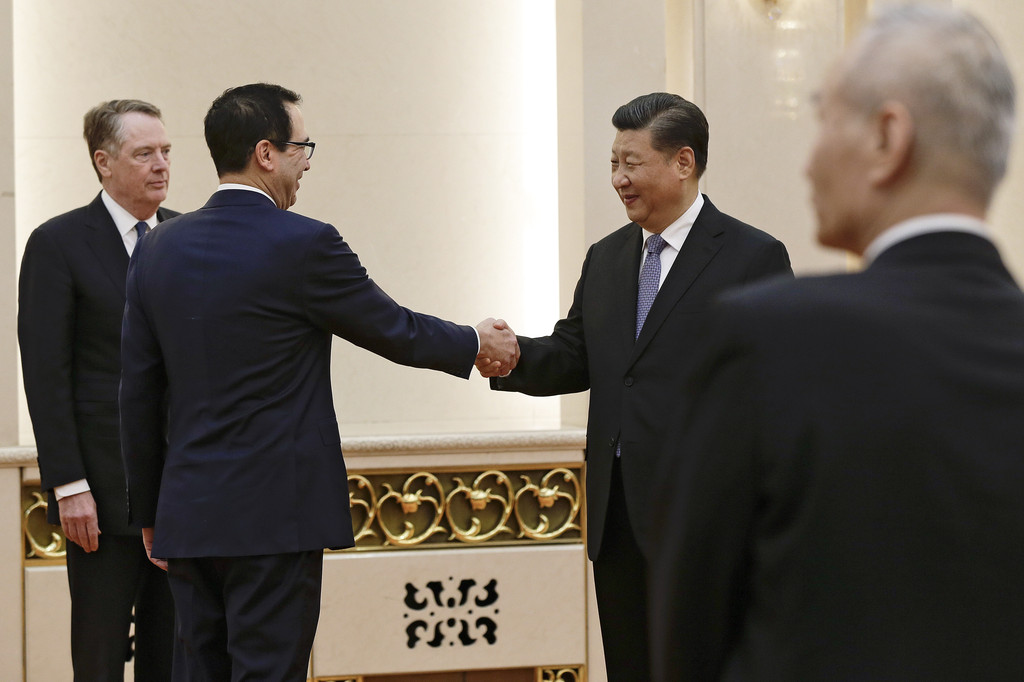 在經歷三輪中美貿易談判後,大陸國家主席、中共中央總書記習近平,與美國貿易代表萊特海澤(Robert Lighthizer)和財政部長梅努欽(Steven Mnuchin)會晤。兩國結束早上的談判後,代表團拍攝大合照,但兩國未足以達成協議,雙方同意下周於華盛頓繼續談判。