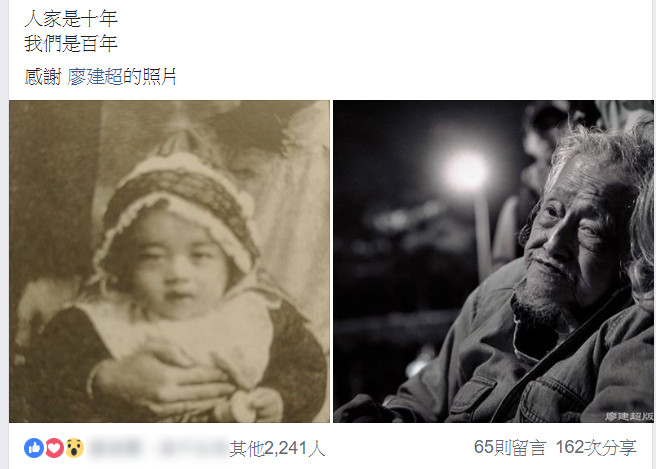 「人家是十年,我們是百年。」史明的個人臉書上貼出2張照片,一張是嬰兒時期、被大人抱著的泛黃照,另一張則是2017年史明在凱道慶生的照片,2張圖相差了近百年,完勝一般人的10年挑戰。