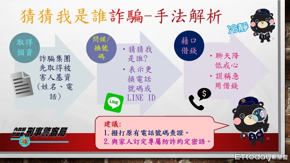刑事局分析該案例指出:新北市一名王先生,上週接到自稱里長來電,因里長表示電話號碼有變更,特地來電通知一聲,王先生倍感親切,認為現在里長服務都很敬業。這名里長2天後以該電話號碼來電向王先生表示,因為貨款支付問題,想跟王先生借新臺幣5萬元應急。