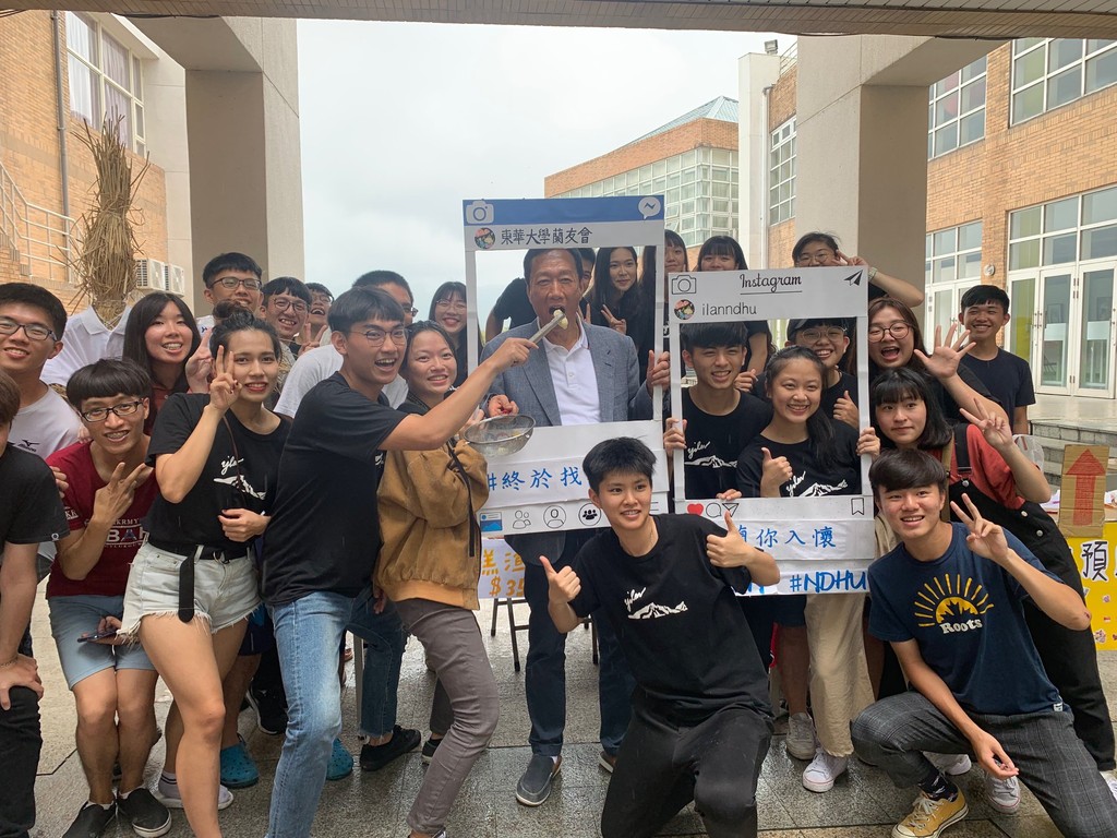鴻海董事長、國民黨總統初選參選人郭台銘到花東進行產業學習之旅,他17日中午到東華大學學生餐廳,和永齡.鴻海台灣希望小學東華分校的教育及社工專員一起吃午飯,離開時,遇到一群東華大學蘭友會同學辦活動,還被學生餵食「糕渣」,讓他感受到大家的活力熱情,也有感而發po文「我會更堅定地走在幫助年輕人的道路上」。