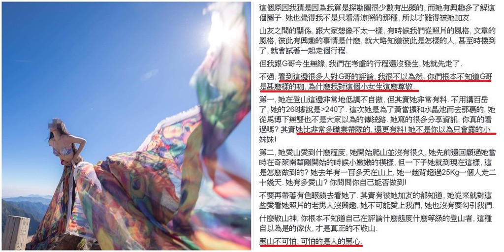 被譽為「比基尼登山客」的吳女(36歲)日前挑戰八通關-盆駒山-無雙社路段,不料卻於19日失足摔落山谷,急忙透過衛星電話向外求援,但最後被發現時已經無生命跡象。消息曝光後許多山友都在臉書哀悼,但也有酸民嗆「穿清涼照勾引男人」;對此一名蔡姓網友列出2點表示,「看到這邊很多人對G哥的評論,我很不以為然,你們根本不知道G哥是甚麼樣的咖。」