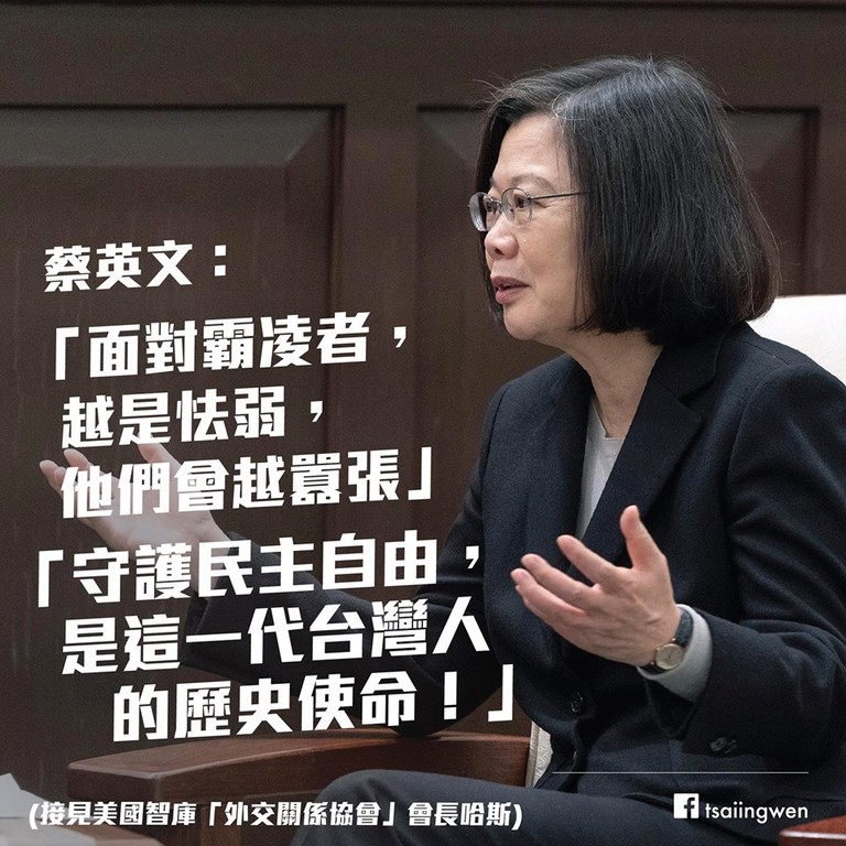 總統蔡英文21日晚間在臉書發文,再次向國際友人發聲,強調「面對霸凌者,越是怯弱,他們會越囂張」,這一代台灣人有一個歷史使命,就是要維護台灣民主不受威脅,不同的民調也顯示,「政府守護主權,拒絕一國兩制的努力,確實得到國人的普遍認同。」