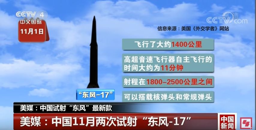 大陸知名軍評陳光文撰文分析,實際上,東風-17實際上就是DF-ZF的武器化型號,該型導彈具備三大特點引發全球關注,一是它使用了高超聲速滑翔技術,二是可以攜帶核戰鬥部,三是「可以在一小時內打遍世界」。據一名中國導彈技術專家指出,東風-17是一款中程、彈道式、單級、常規導彈,可以在再入大氣層的前後進行滑翔變軌飛行,「目前沒有哪個國家可以攔截」。