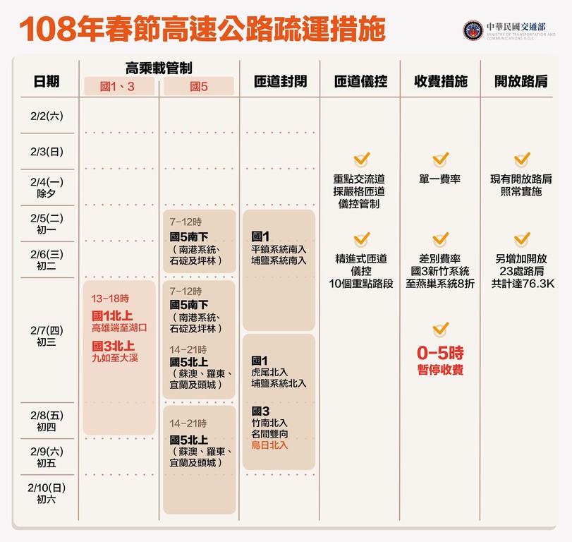 (三) 108年2月7日(初三) 至10日(初六)14至21時,實施國5蘇澳至頭城,各交流道之北向入口匝道高乘載管制。另國5北向高乘載結束時間將視交通狀況機動調整。