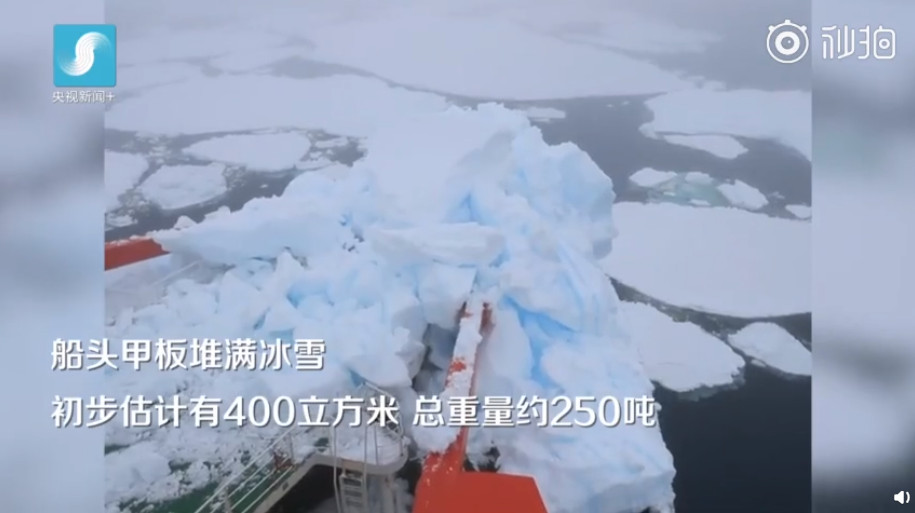 大陸考察船、破冰船「雪龍號」19日在執行第35次南極考察任務期間,因受濃霧影響碰撞冰山。據央視新聞畫面顯示,船頭甲板堆滿冰雪,體積初步估計有400立方米,總重量約250噸,船艏桅杆已經斷裂,所幸船上無人員受傷。目前,「雪龍號」運行正常。