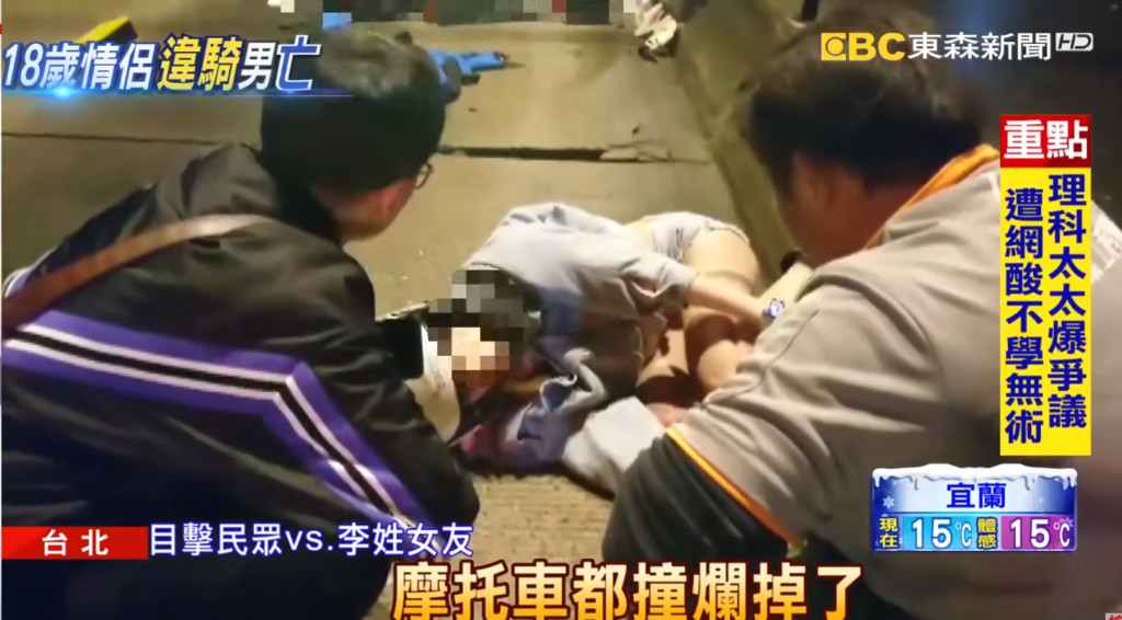 警方表示,皆為18歲的林男載著李姓女友從公館出發,往景美方向行駛,並在萬盛街口時闖入公車道,不明原因打滑而撞上分隔島,導致林男的頭撞破,經急救後送醫不治,機車也撞到全毀,零件碎散滿地。