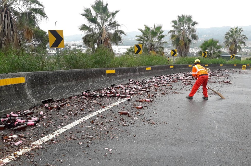 滿載台酒公司米酒的大貨車22日行經國道3號中興交流道匝道過彎時,疑因未綁緊貨物,2000瓶米酒甩落地面,近半破裂。民眾在臉書社團「南投人聊天室」發文,呼籲大家路過要小心,卻遭網友笑稱「路過聞多就酒駕了!」所幸1個多小時後就清理完畢,也沒有人因此變成酒駕被警察抓。