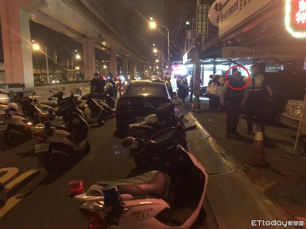 ▲自稱竹聯幫孝堂成員的洗車場老闆由姓男子被警方帶回派出所訊問。(圖/記者趙永博攝)