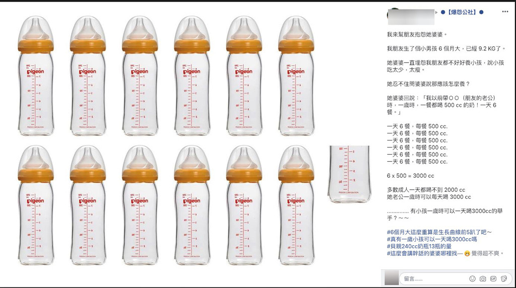 因為婆婆透露「我以前帶OO(朋友的老公)時,一歲時,一餐都喝500c.c.的奶!一天6餐。」這驚人奶量讓原PO發文說「多數成人一天都喝不到2000c.c.,她老公一歲時可以每天喝3000c.c.?」、「這麼會講幹話的婆婆哪裡找」。