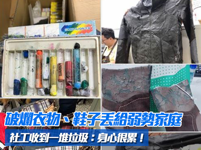 過年就要到了,許多人會在大掃除時整理出不會用到的物品。然而,劉柏君所工作的新北愛馨物資分享中心卻收到一堆垃圾,包括斷掉的蠟筆、不能使用的包包、明顯破損的皮衣等,還有已經穿到爛的鞋子,不然就是發霉的櫃子。