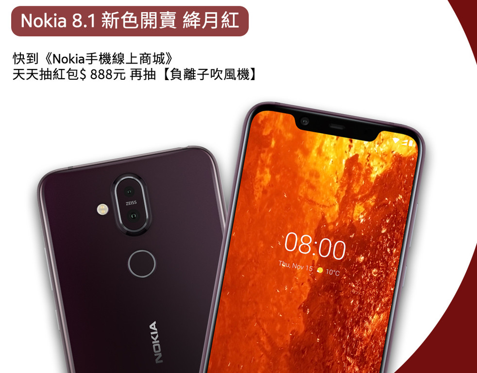Nokia 8.1主打高感光蔡司鏡頭的出色夜拍效果,並採用PureDisplay顯示技術,支援HDR播放,使色彩呈現更加鮮明飽和;此外,更搭載6.18吋FHD+無極限大螢幕、強勁效能的高通驍龍(Snapdragon)710處理器,綜合以上媲美旗艦等級的頂級規格,加上平易近人的價格,讓人愛不釋手。Nokia 8.1 絳月紅單機建議售價9,990元,將於1/24 (四)中午12:00在Nokia手機線上商城開放預購,亦可於momo購物網、PChome 24h購物、Yahoo奇摩購物中心及各大經銷商同步預購。