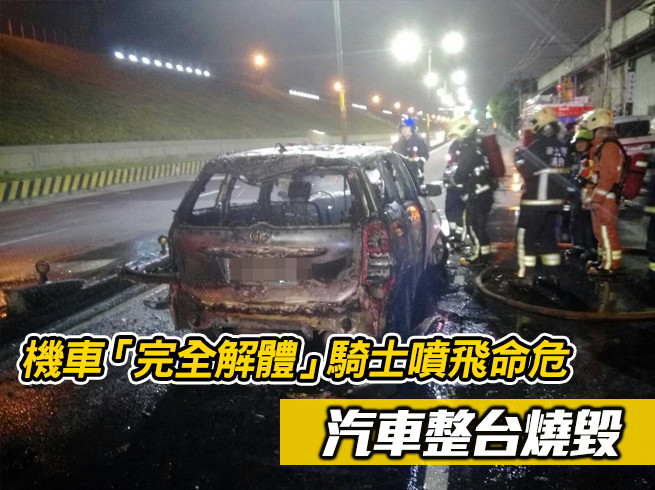 蘆洲驚傳火燒車死亡案!新北市消防局23日晚間7時許接獲通報,指稱在蘆洲區環堤大道有汽車起火,車內無人;警消到場時,發現汽車已經全面燃燒,疑似為引擎起火,起因是一名捷運保全騎車與汽車擦撞造成,機車現場解體倒在路旁,保全噴飛10米失去生命徵象倒地,警消將其緊急送醫治療仍不治,詳細的車禍原因仍待進一步釐清。
