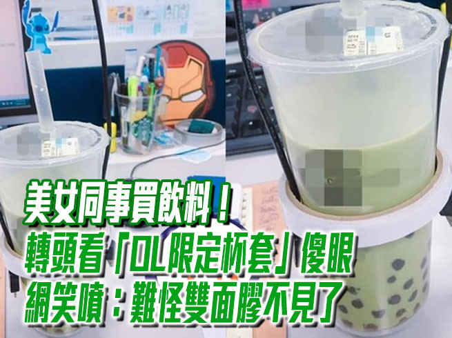 「美女同事說要這樣把飲料提回家……」,一名男網友在臉書《爆廢公社》貼出一張照片,只見美女同事買了一杯珍珠系列的飲料,飲料杯上則套著一個「有把手的杯套」;但仔細一看,同事用的並不是一般常見的環保杯套,而是「雙面膠+黑色充電線」。