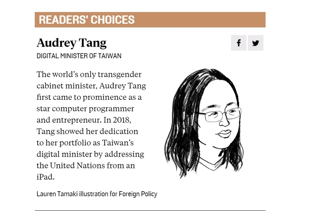 《外交政策》今年將名單分為10大項,唐鳳入選的是「讀者選擇」,該期刊網站上介紹道,「唐鳳是全球唯一的跨性別內閣成員,她曾是知名電腦程式設計師與企業家,2018年時,以台灣數位閣員的身分,透過iPad視訊在聯合國發表演說。」