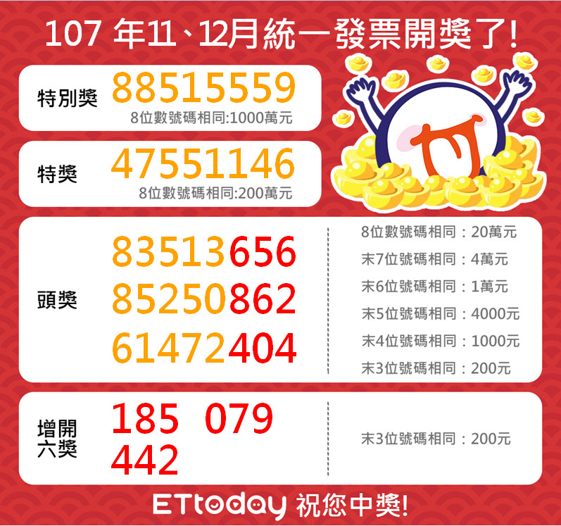 又到了單月份統一發票開獎的時刻,今日開獎的是去(107)年11-12月期統一發票,想幫自己加年終就看這次了,本期千萬特別獎號碼是88515559,快看看幸運兒是不是你!