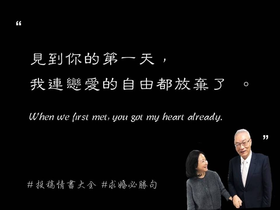對此,吳敦義24日表示,「國瑜兄,聽說你最近要出版情書大全,開放徵稿的話,你看看我這句行不行?」,而這句情話就是,「見到你的第一天,我連戀愛的自由都放棄了」,這句是對他向妻子求婚的話,自認「求婚必勝句」。