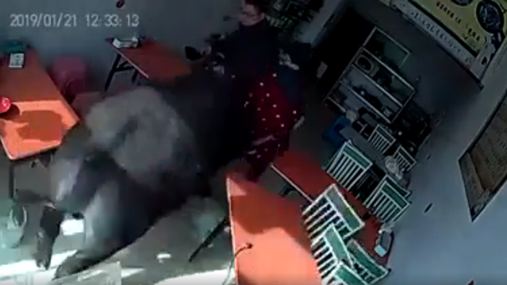 大陸江蘇省日前發生一起牛攻擊人的意外,有一隻體型壯碩的黑牛突然發狂似地追逐著一名紅衣女子,女子跑進餐廳躲避,結果黑牛依然窮追不捨,造成紅衣女子和餐廳店員走避不及被撞倒,店內的桌椅也都被撞得東倒西歪,紅衣女子就醫後縫了3針,並無大礙。