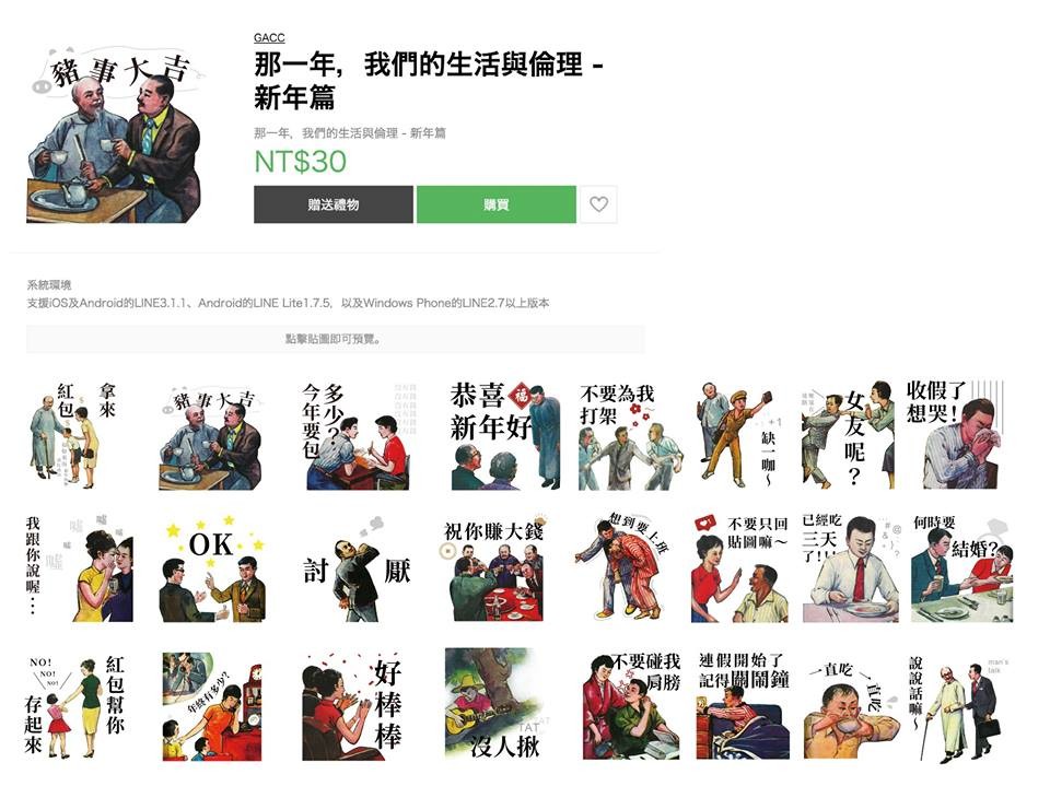 文總指出,《那一年,我們的生活與倫理》LINE貼圖、線上互動遊戲,正式上線首波推出的「#新年篇」貼圖今天正式上架,共有24張不同角色情境,文總並hashtag「很有禮貌的新年問候」。