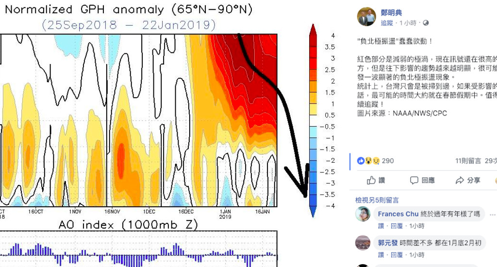 鄭明典今日發佈貼文指出,目前極渦訊號雖然還在很高的地方,但是往下影響的趨勢越來越明顯,很可能引發一波顯著的負北極振盪現象。鄭明典說,統計上,台灣只會是被掃到邊,但如果受影響的話,最可能的時間大約就在春節假期中,值得持續追蹤。