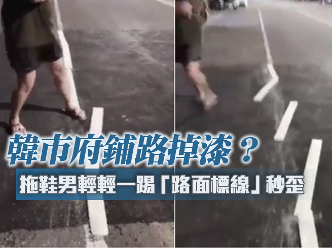 高雄市長韓國瑜曾發話一定會把路鋪平,但卻有民眾日前在臉書社團「爆料公社」上傳一段影片,從畫面中可以看出,路面才剛剛鋪好,但白色的標線卻怎麼看都讓人覺得不對勁,而此時一名穿拖鞋的男子輕輕一踢,竟然就當場把標線踢斷成好幾截,一秒變虛線。對此,網友也紛紛笑翻,「原來是用大型立可帶啊~」、「可以變成斑馬線耶」。