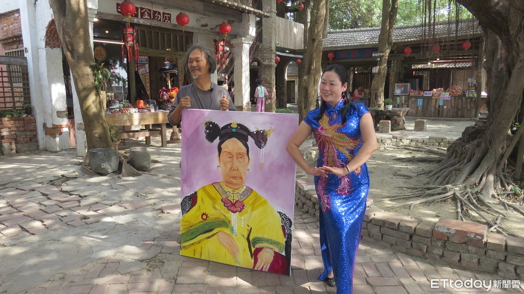 ▲台灣手指畫家匡乙展示最近要完成的一幅用手指畫作「清代慈禧」,歡迎大家來「老塘湖藝術村」觀賞。(圖/記者林悅翻攝,下同)