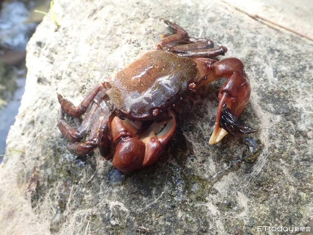 ▲剛毛假方蟹螯足上長滿了黑色硬毛,形似郝柏村的招牌眉毛,部落的族人叫做「郝柏村蟹」型態特殊容易辨識。(圖/花蓮林管處提供)