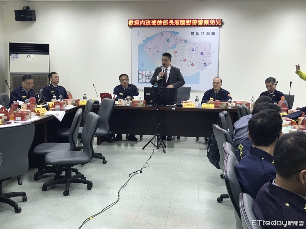 ▲內政部部長徐國勇南下台南市,與台南市警四分局員警餐敘,聽取當日執行地檢署勤務簡報,同時也肯定所有執行勤務員警處理聚眾活動之辛勞。(圖/記者林悅翻攝,下同)