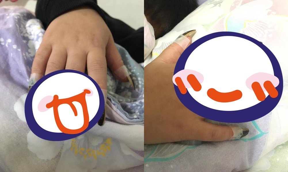 這位媽媽在臉書《爆廢公社》笑說「半夜醒來突然看見一隻魔手」,並標註「#孩子那只是瓜子殼啊!」「#是有沒有這麼想扮演金鋼狼」、「#過年光療指甲不知做什麼的可以參考一下」。仔細看看照片,原PO的兒子把一隻小手放在床上,但他的手指怎麼看起來怪怪的?