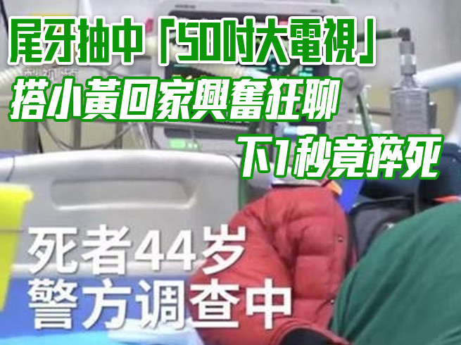 遼寧瀋陽一名44歲的男子穿著紅衣,25日參加公司尾牙時抽中「50吋彩色電視」。在搭計程車回家的過程中,「幸運男」帶著酒意、情緒高昂地跟駕駛聊天,直說「運氣真好」,沒想到下一秒卻突然大口喘氣、身體僵直,最後在半路上猝死,送醫急救仍宣告不治。司機回憶說,「再過一個路口就是他家了」。