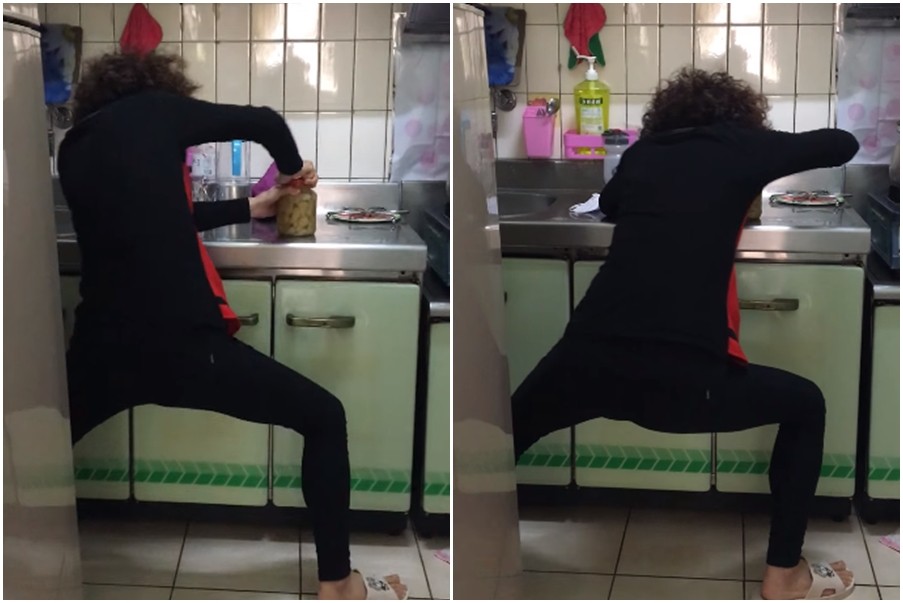 影片曝光,超過2萬5000人按讚、2千300多人蓋樓留言:「笑死,浮誇系」、「古錐的媽媽」、「媽媽開得很不爽」、「這馬步蹲得紮實啊」、「最後那一拍感受到媽媽的怒氣」、「這個姿勢,我給滿分」、「最後一擊有用內力」、「我麵噴出來」、「開罐很有架勢」、「一看就覺得,已經使出洪荒之力」、「看10次笑10次,哈哈哈」。