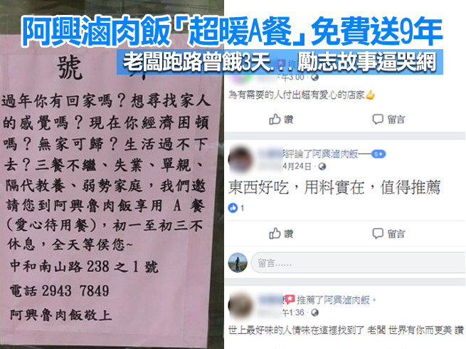 新北市「阿興滷肉飯」日前在臉書粉專貼出公告表示,「歡迎有需要的朋友今年來給我們請喔!」只見公告上邀請「尋找家人感覺、經濟困頓、無家可歸、三餐不繼」的人到店內免費享用「A餐」(愛心待用餐),且初一到初三照常營業,全天等候著顧客的到來,相當暖心。
