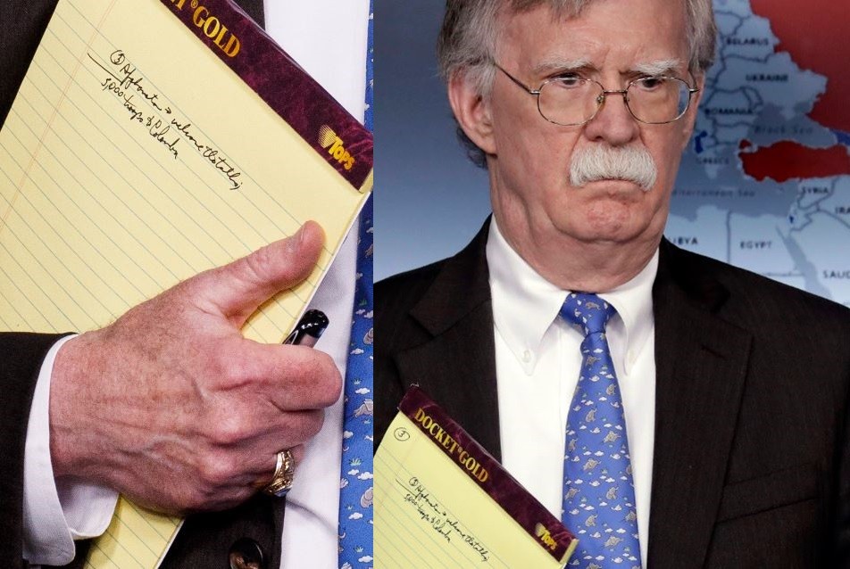 ▲ 波頓的記事本上寫著「派5000軍隊至哥倫比亞」。(圖/達志影像/美聯社)