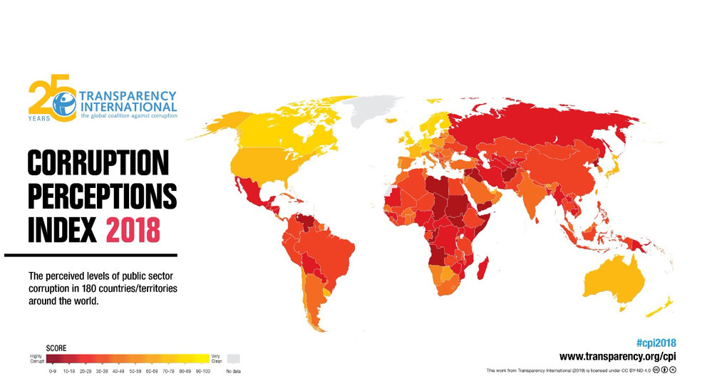 國際透明組織評比全球180個國家和地區,2018年丹麥超越紐西蘭,成為全球最清廉的國家,芬蘭、新加坡、瑞典和瑞士同分名列第3,南蘇丹和敘利亞同分位居第178名,是全球最貪腐國家,而台灣63分,排名第31名,分數跟2017年相同、名次則是退步2名,退步因素主要是因為塞席爾與葡萄牙分數提升;另外,超過2/3國家地區的清廉分數低於50分,全球平均分數43分,顯示貪腐問題是各國必須面對的議題。